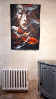 Les peintures sur bois d'Astrid de GEUSER ne sont pas légères, mais il y a de la magie dans l'air. Chaque tableau trouve sa juste place ! Il n'y a pas la moindre hésitation !